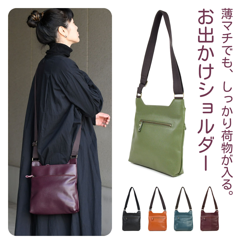 ショルダーバッグ 薄マチ 豊岡工房 日本製 レディース 本革 バッグ レザー 牛革 シボ加工 型押し 多収納 A5 ペットボトルが入る 多機能 コンパクト 革 YKK ファスナー 斜めがけバッグ 斜めがけ 斜め掛け スクエア 薄型 薄手 スマホ 長財布 入る 男女兼用 送料無料